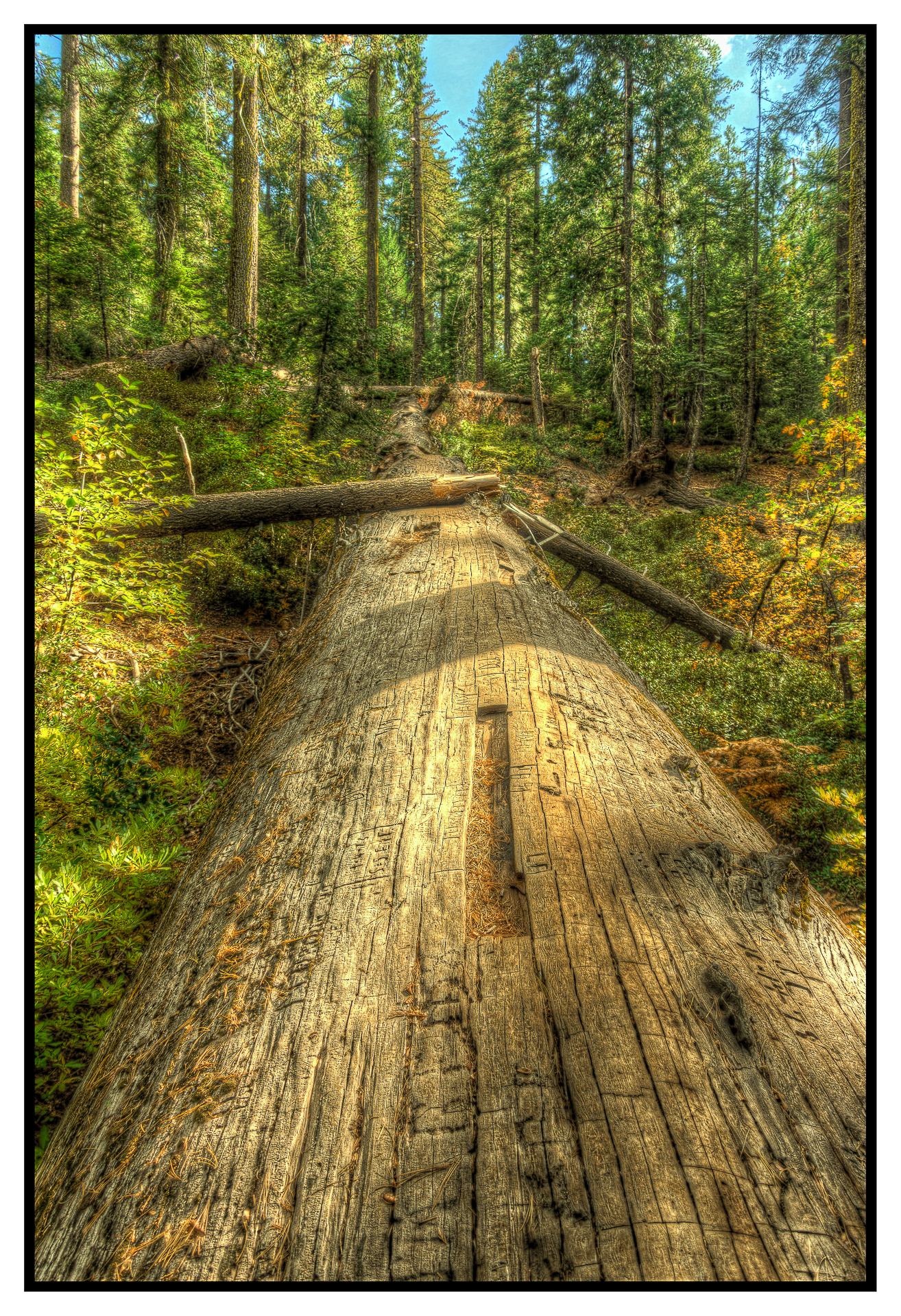 A fallen giant sequoia in Tahoe National Forest with a large pine tree broken on top of it