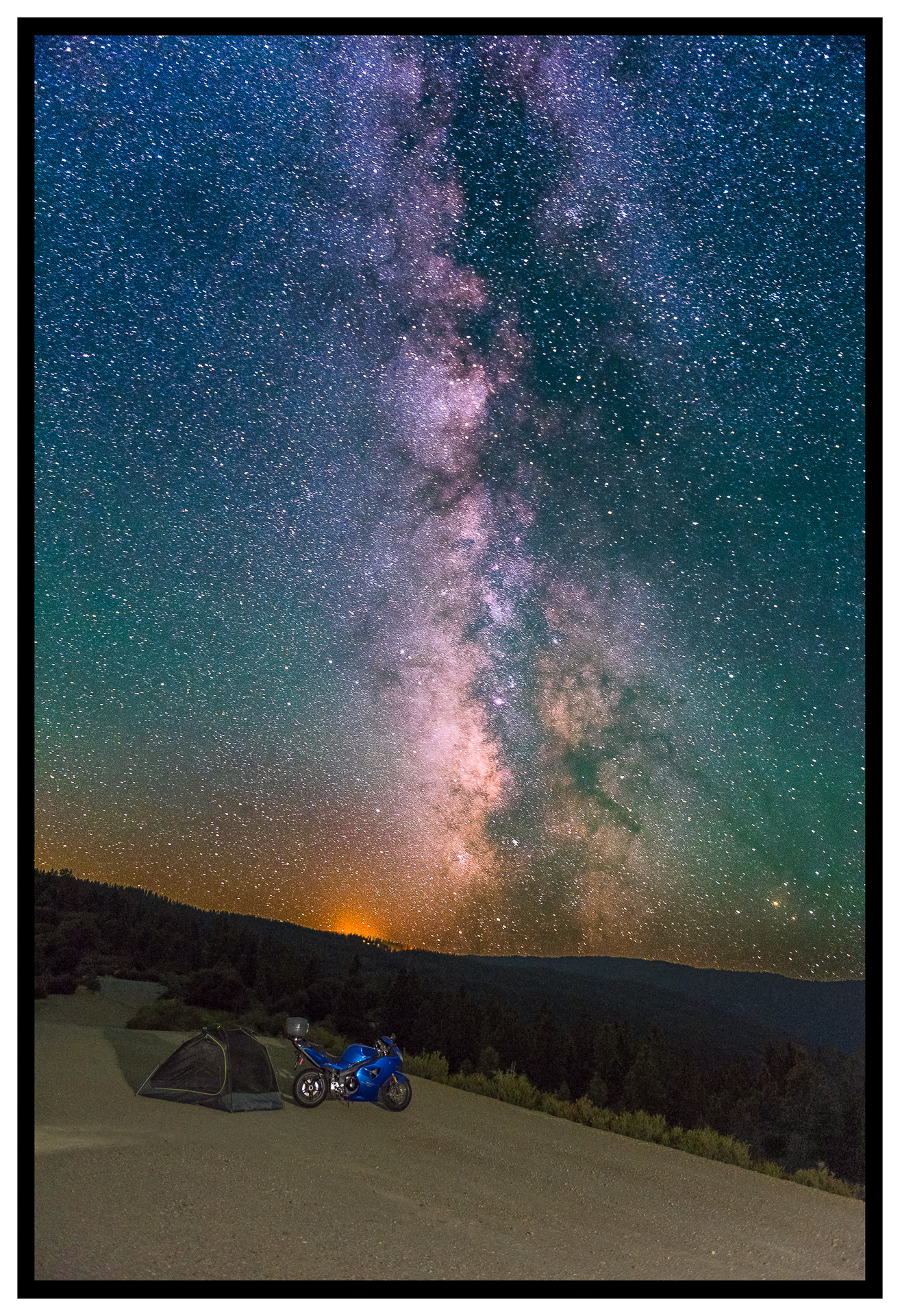 A view of the Milky Way over my bike and my tent on a clear night in Mendocino National Forest.